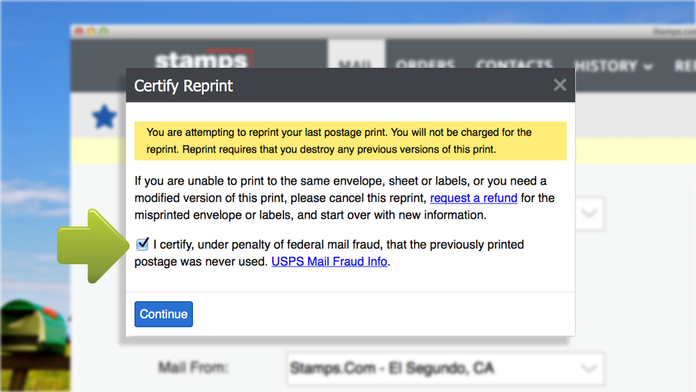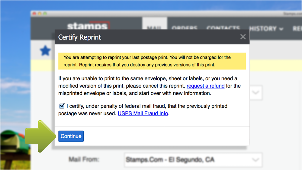 If your shipping label prints incorrectly due to a printer error, you can reprint it immediately after the print from the Mail tab or later from the History tab in the Stamps.com Online app. Stamps.com will reprint shipping labels for no additional charge.