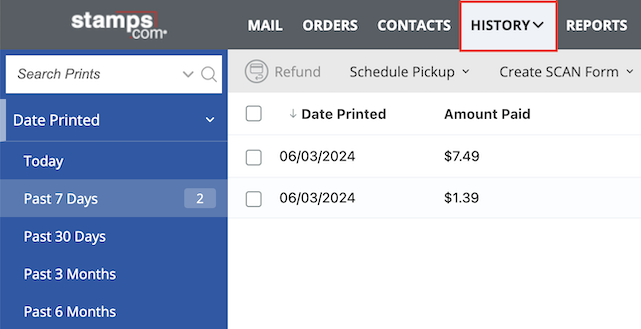 You can also reprint shipping labels from the History tab when using the Stamps.com Online app if your account is on a subscription plan that supports this feature.