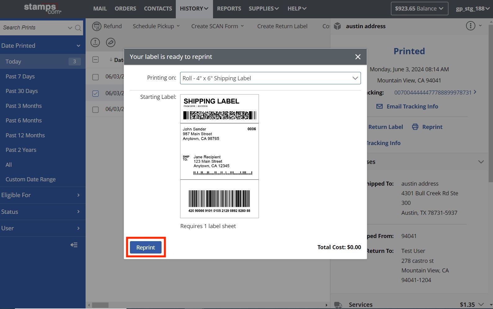 To reprint shipping NetStamps from the History tab via Stamps.com online: