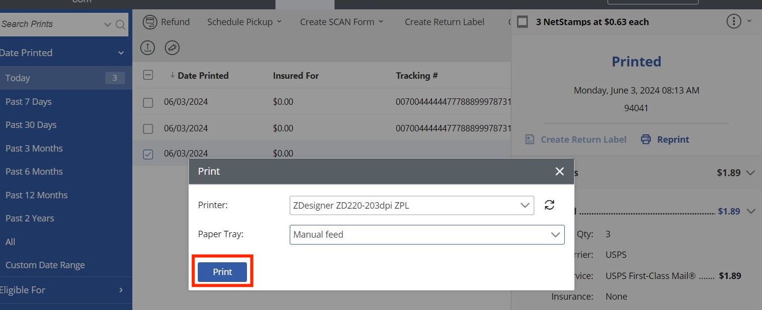Select the correct printer and paper tray, then click Print in the Reprint Postage window.